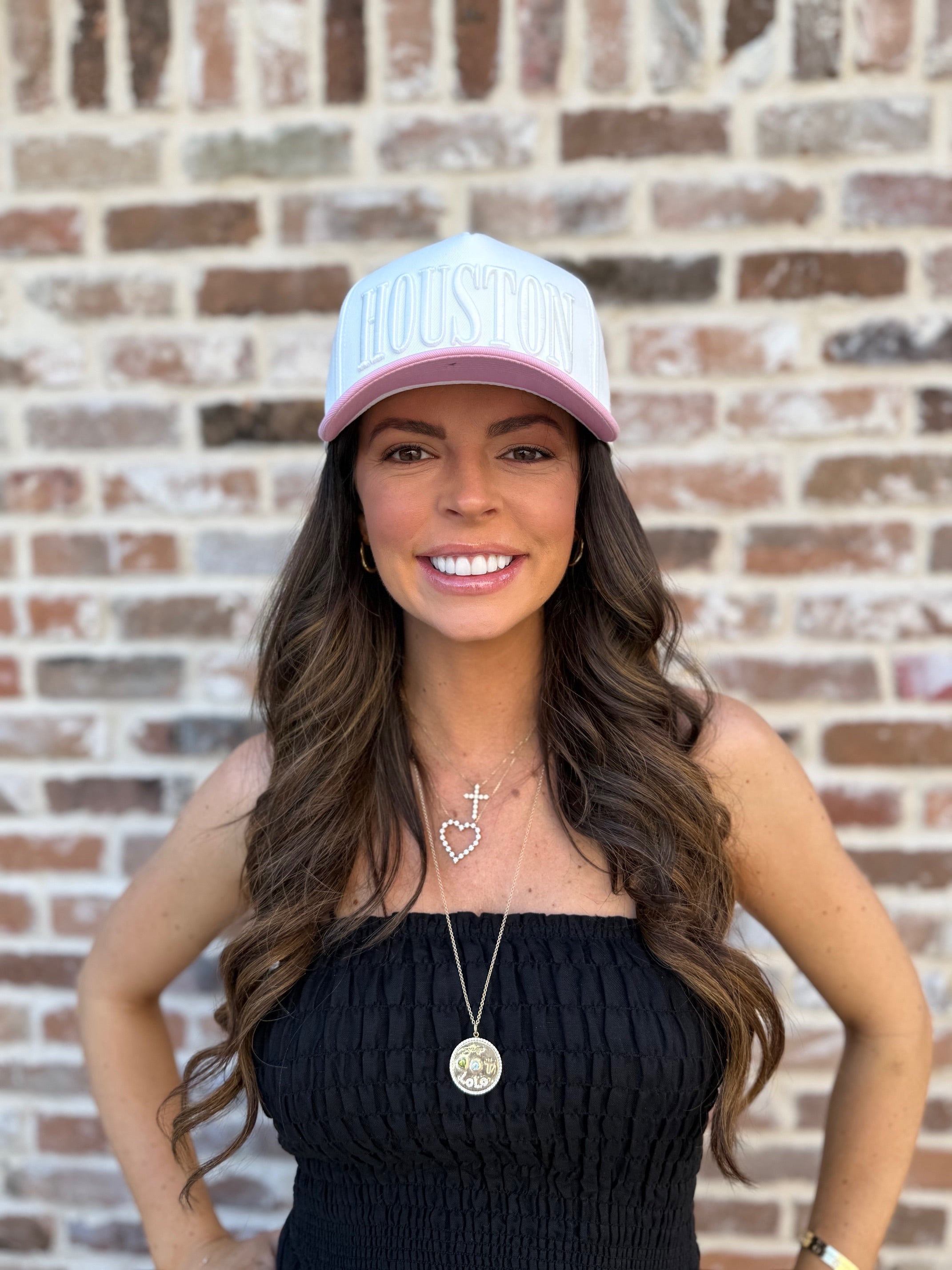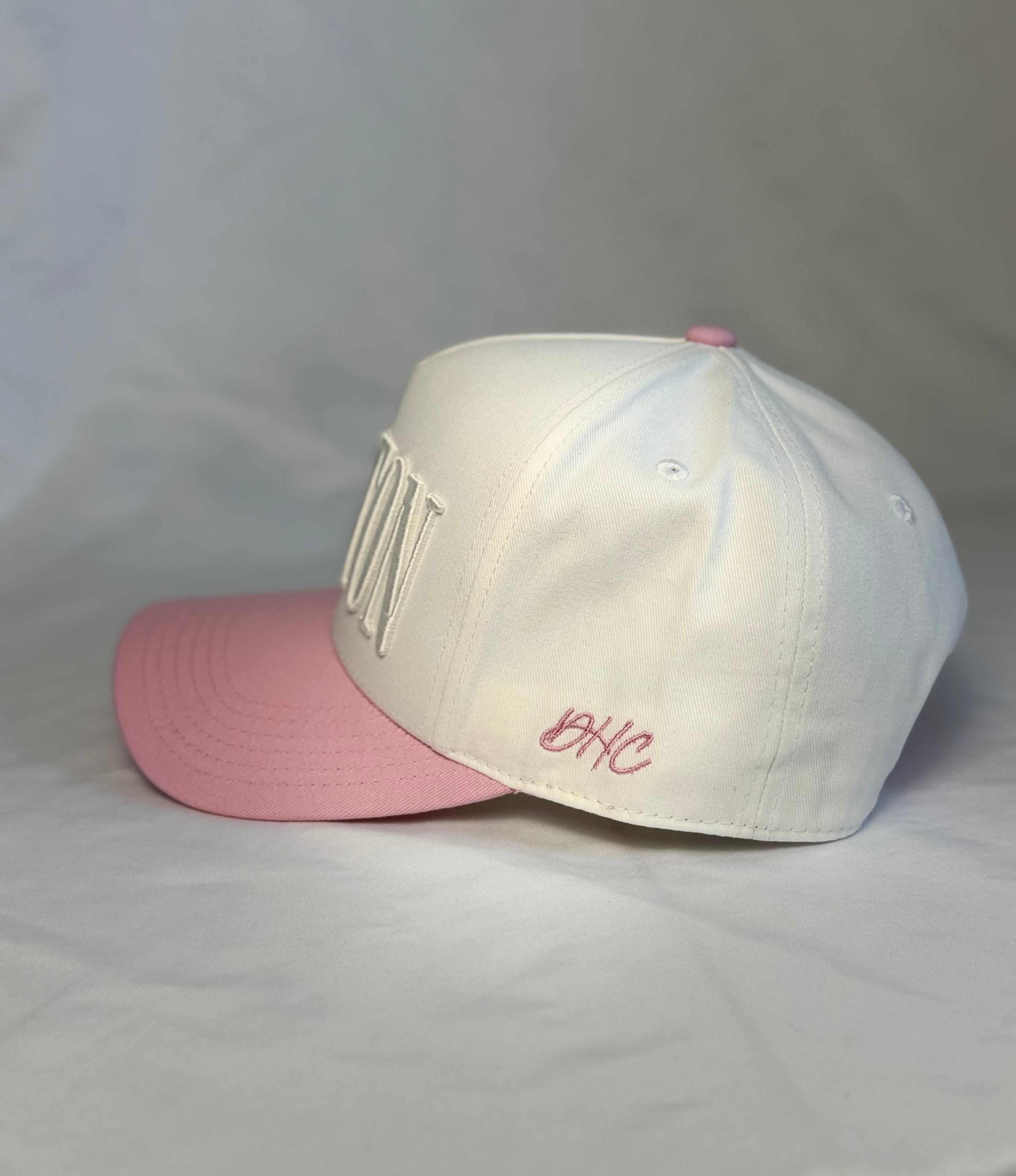 White with pastel pink bill, large HOUSTON puff embroidery in all CAPS, DHC logo side panel, with dark green interior taping.