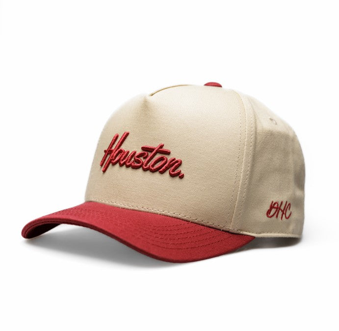 Crimson + Cream snapback featuring Houston. front panel, "H's Up" hand sign for Houston, red snapback, and Decker Hat Co. logos.