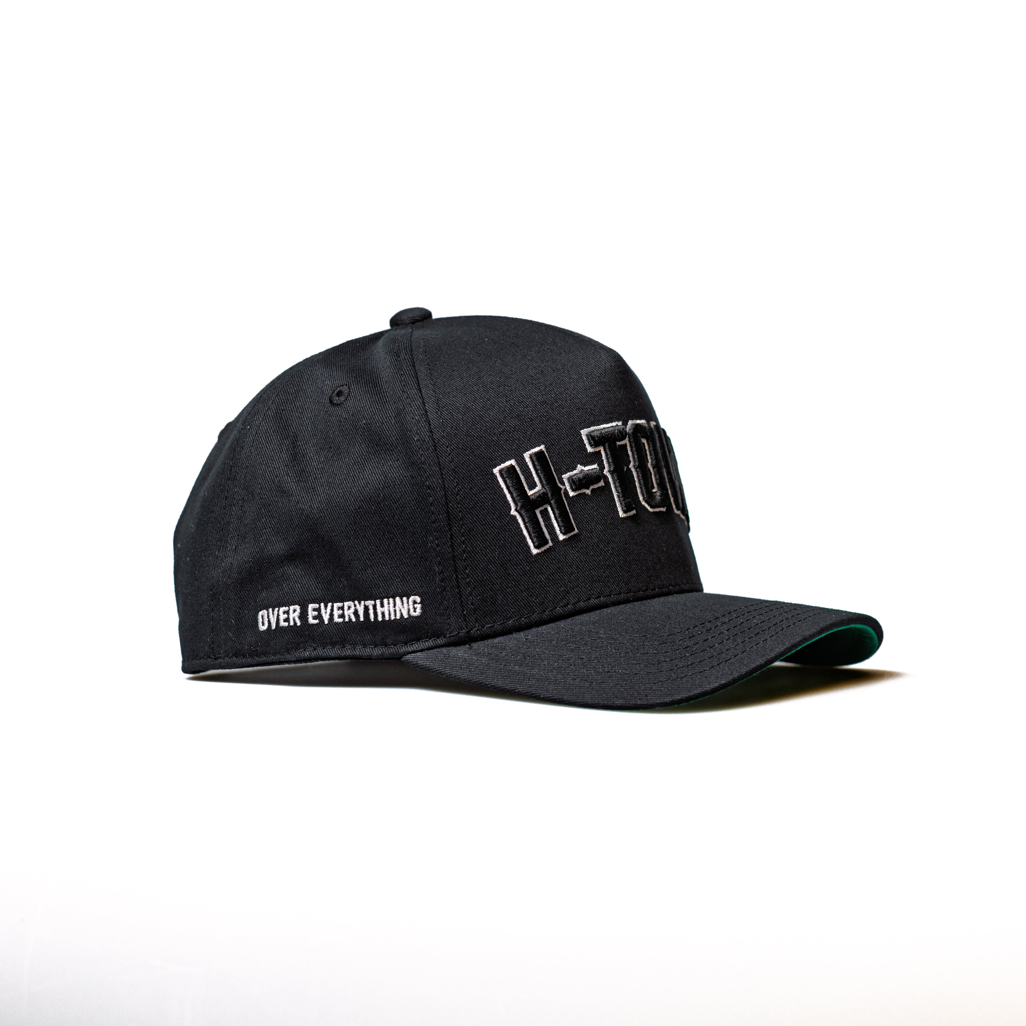 Black with monochrome stitch with white outline. featuring H-TOWN on front panel, "OVER EVERYTHING" side panel, green underbrim, and Decker Hat Co. logos.