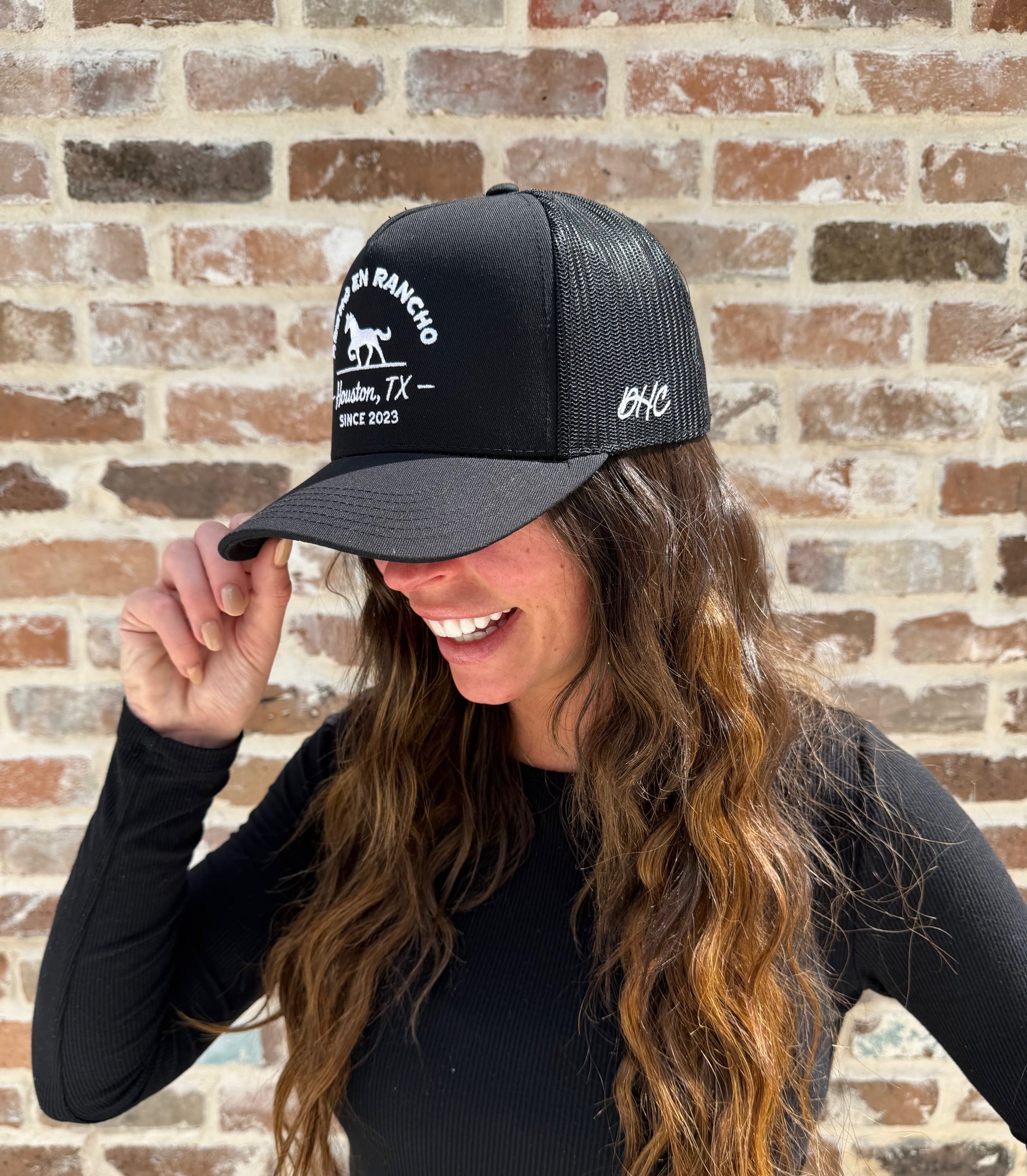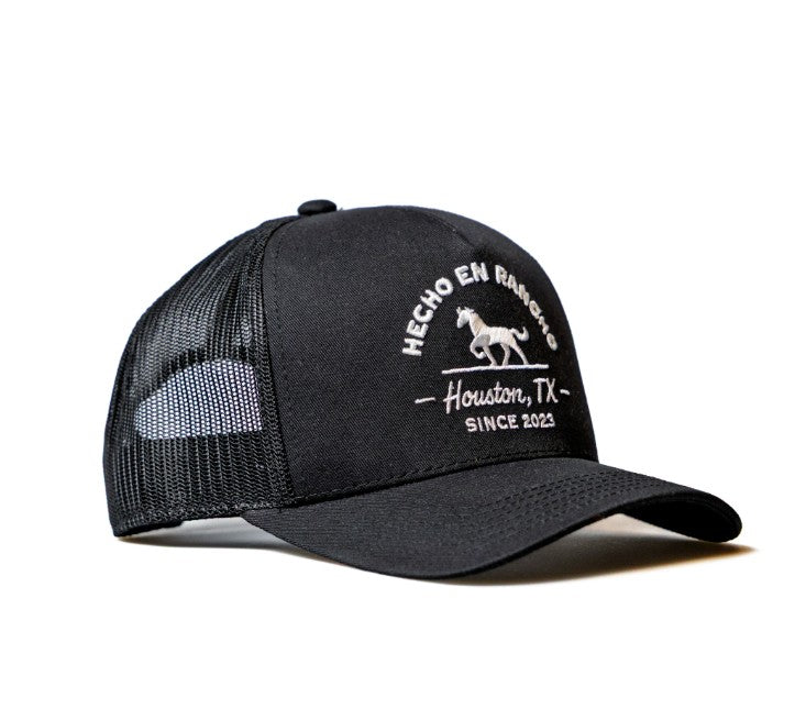 Black trucker snapback with structured cotton front panel and mesh back. Featuring HECHO EN RANCHO (Made on the Ranch) text in white 3D puff embroidery, Houston, TX, since 2023.