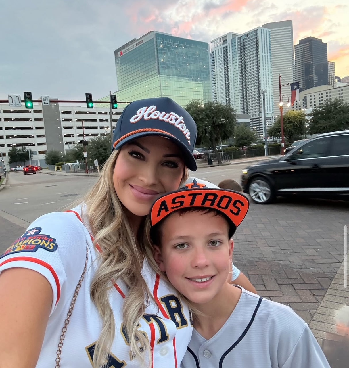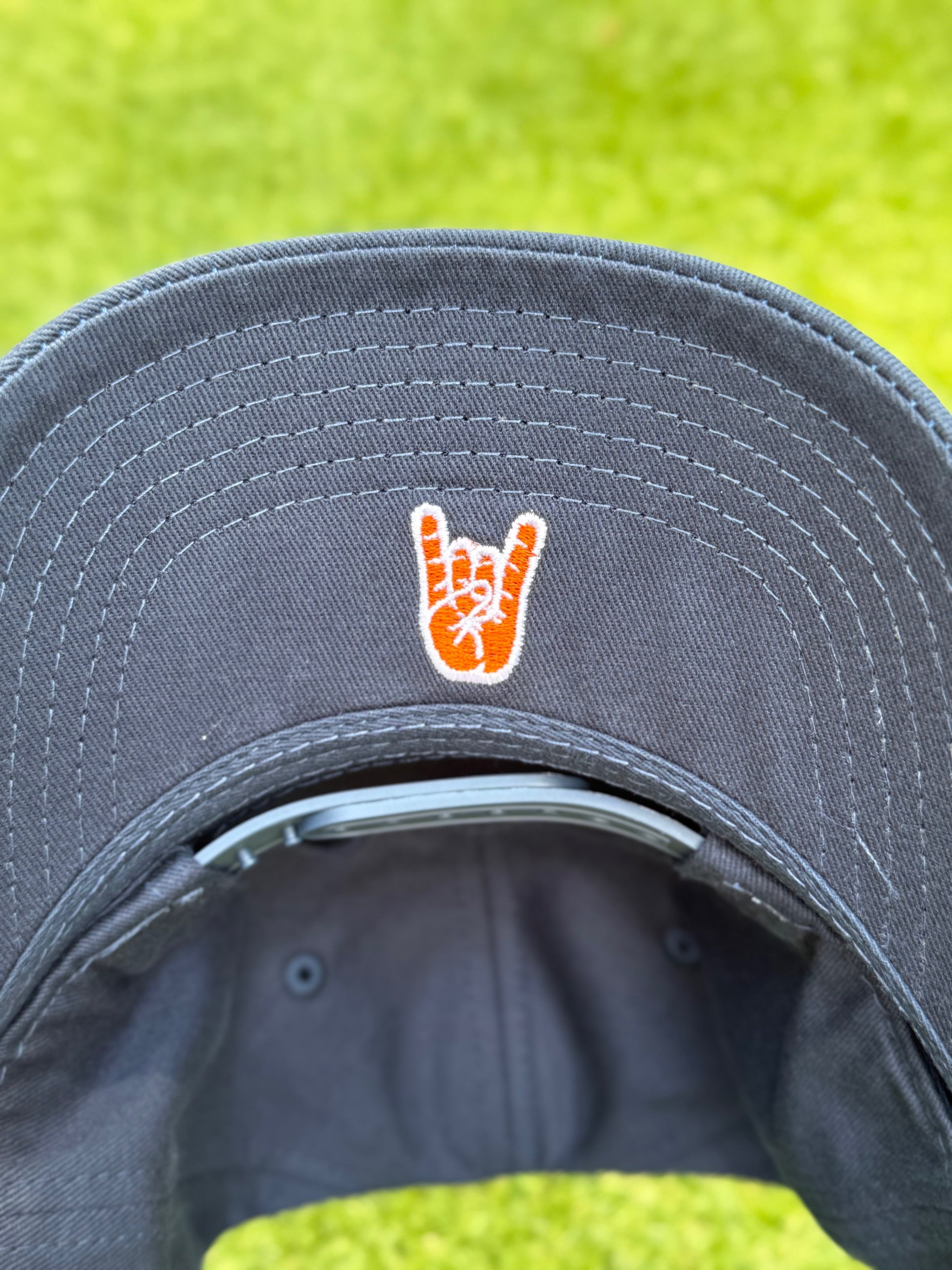 Navy with white stitching, orange rope, and snapback featuring cursive Houston. front panel, "H's Up" hand sign for Houston underneath the bill, and Decker Hat Co. logos.