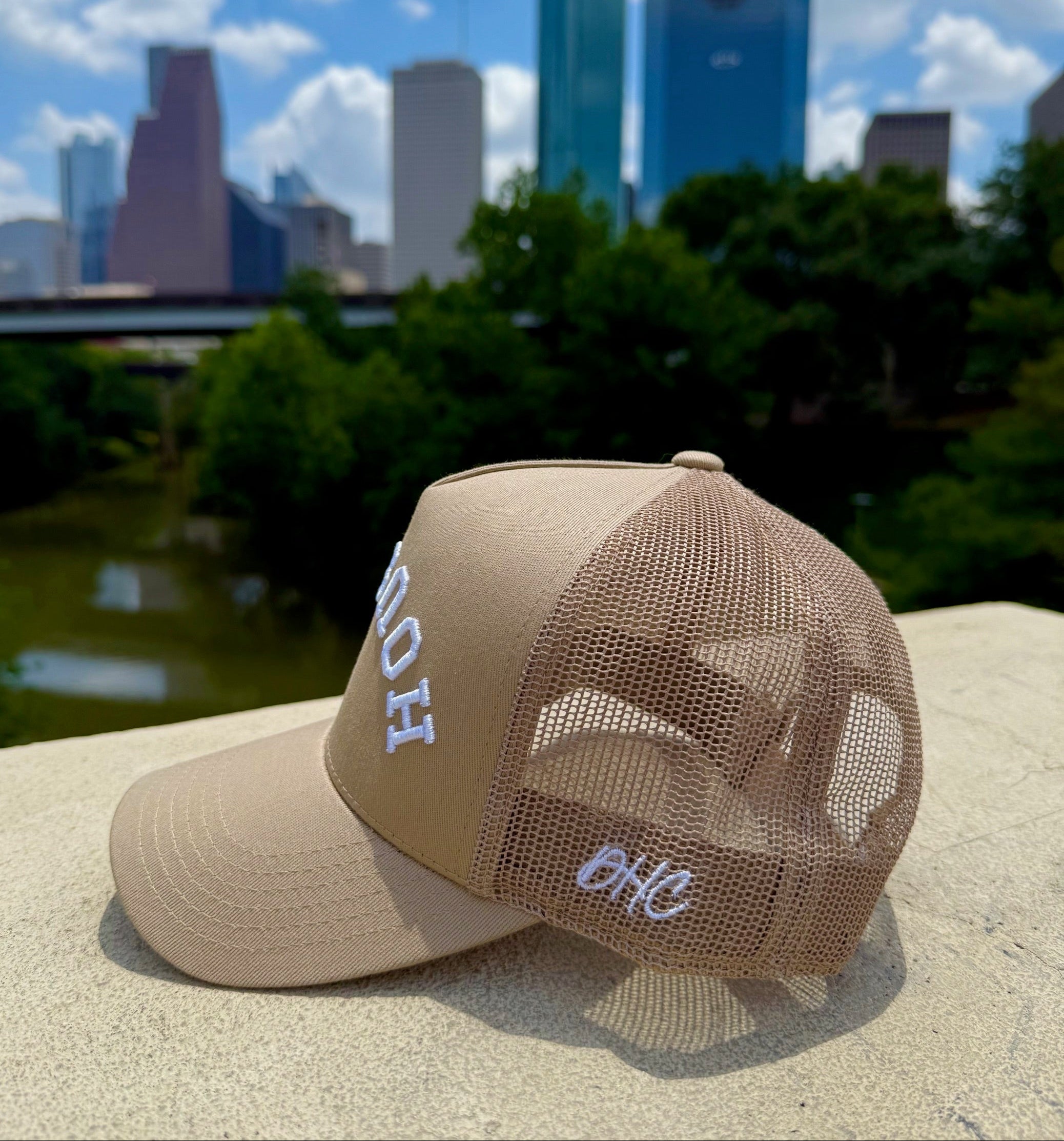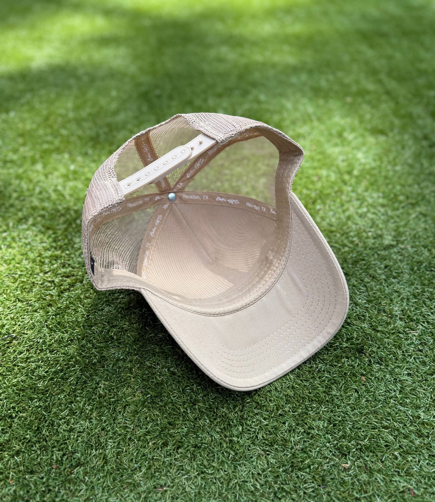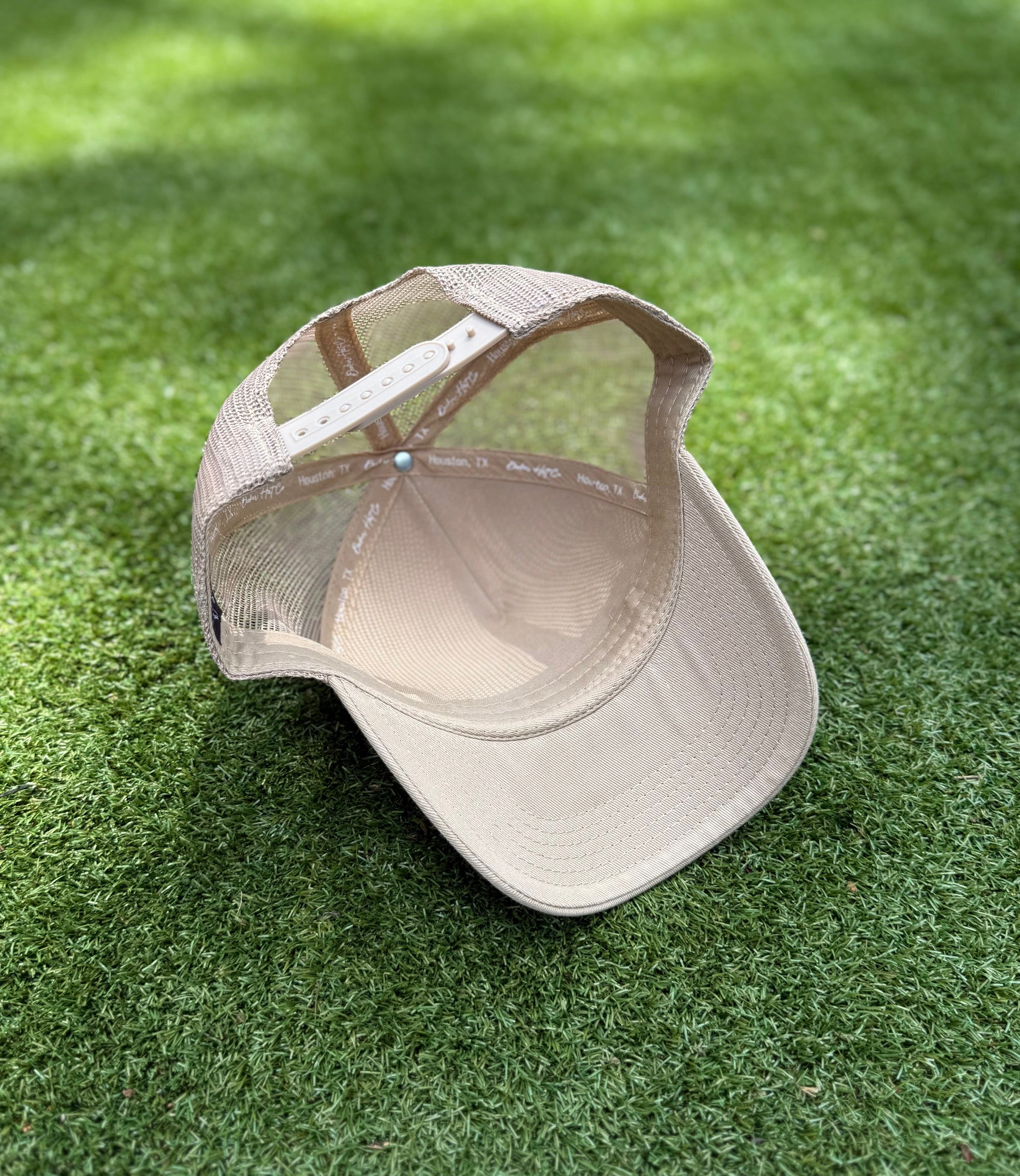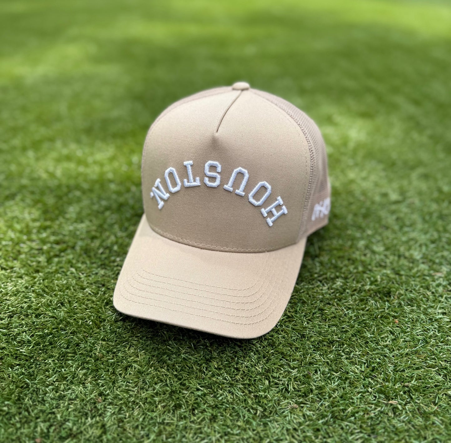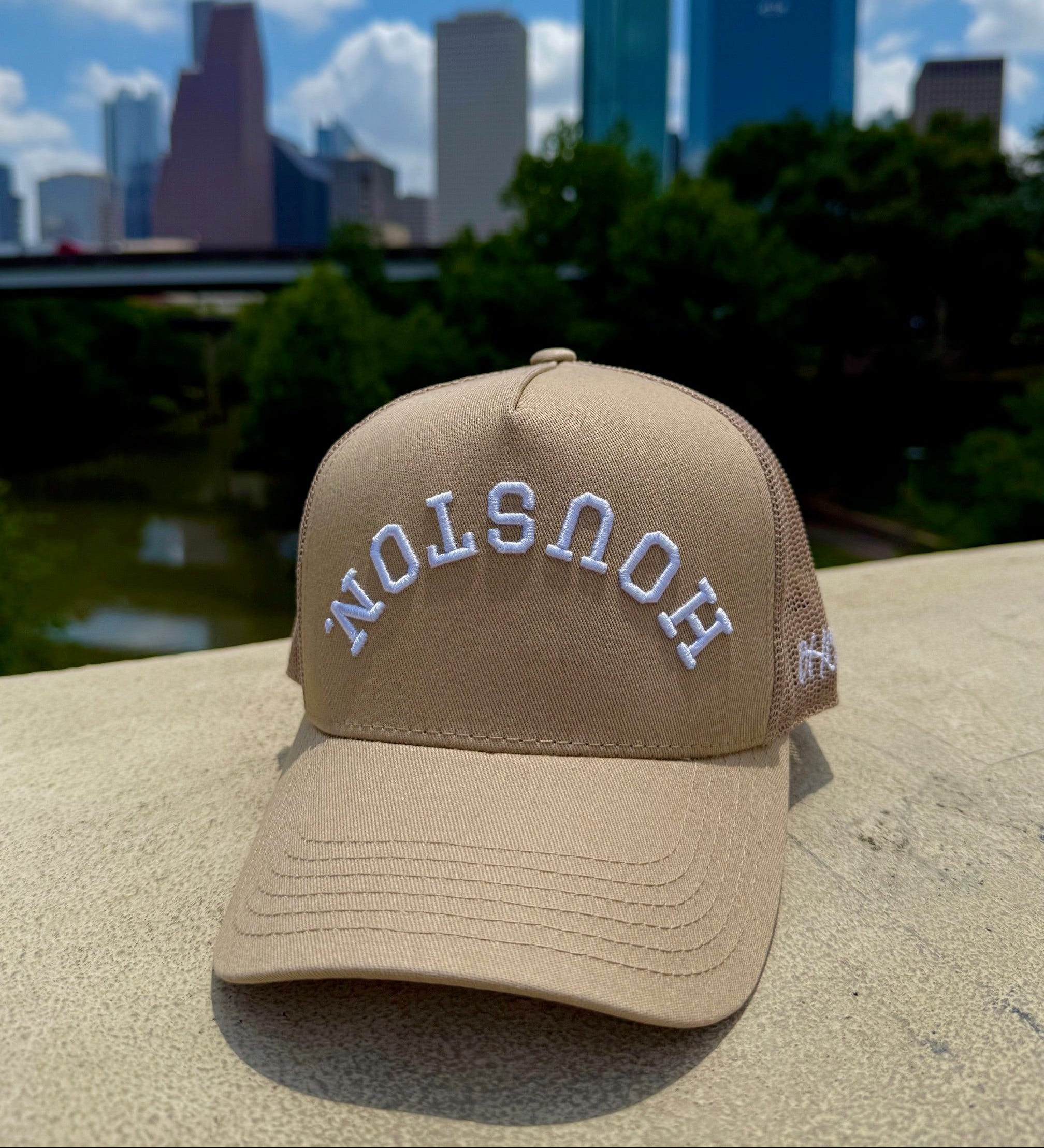 Nude Trucker with structured cotton front panel and mesh back. Featuring upside down HOUSTON., .NOTSUOH™, and Decker Hat Co. logos.