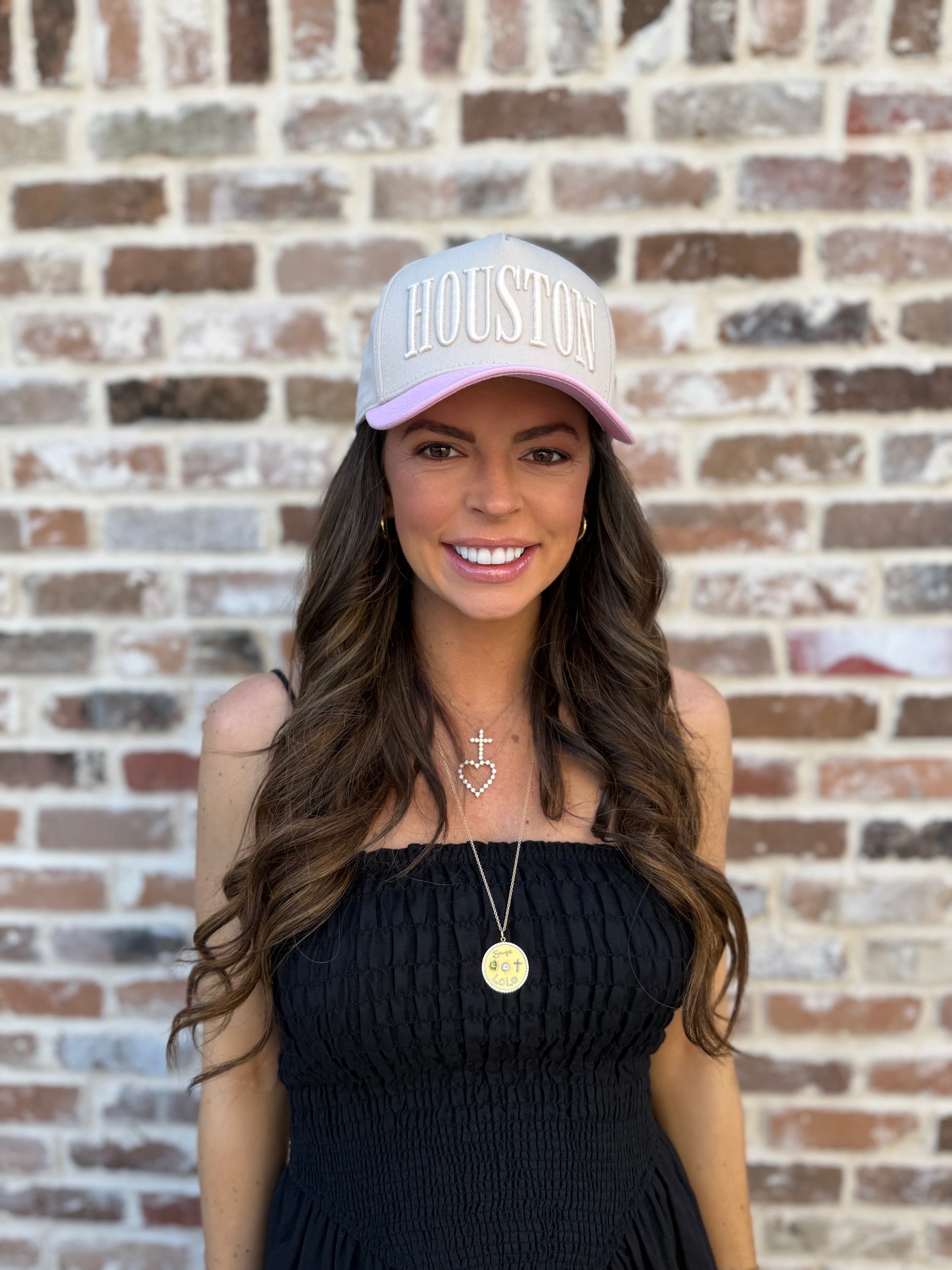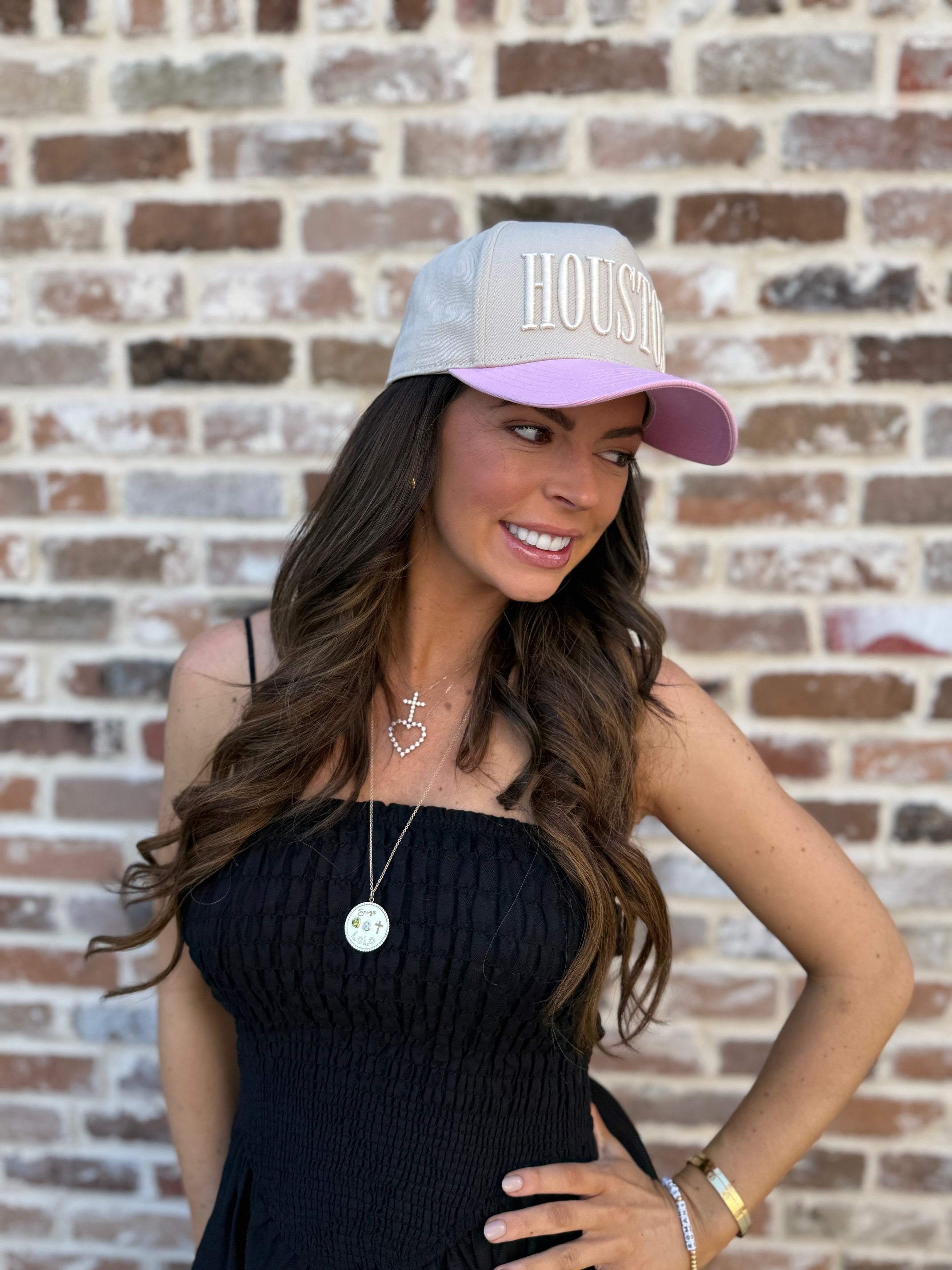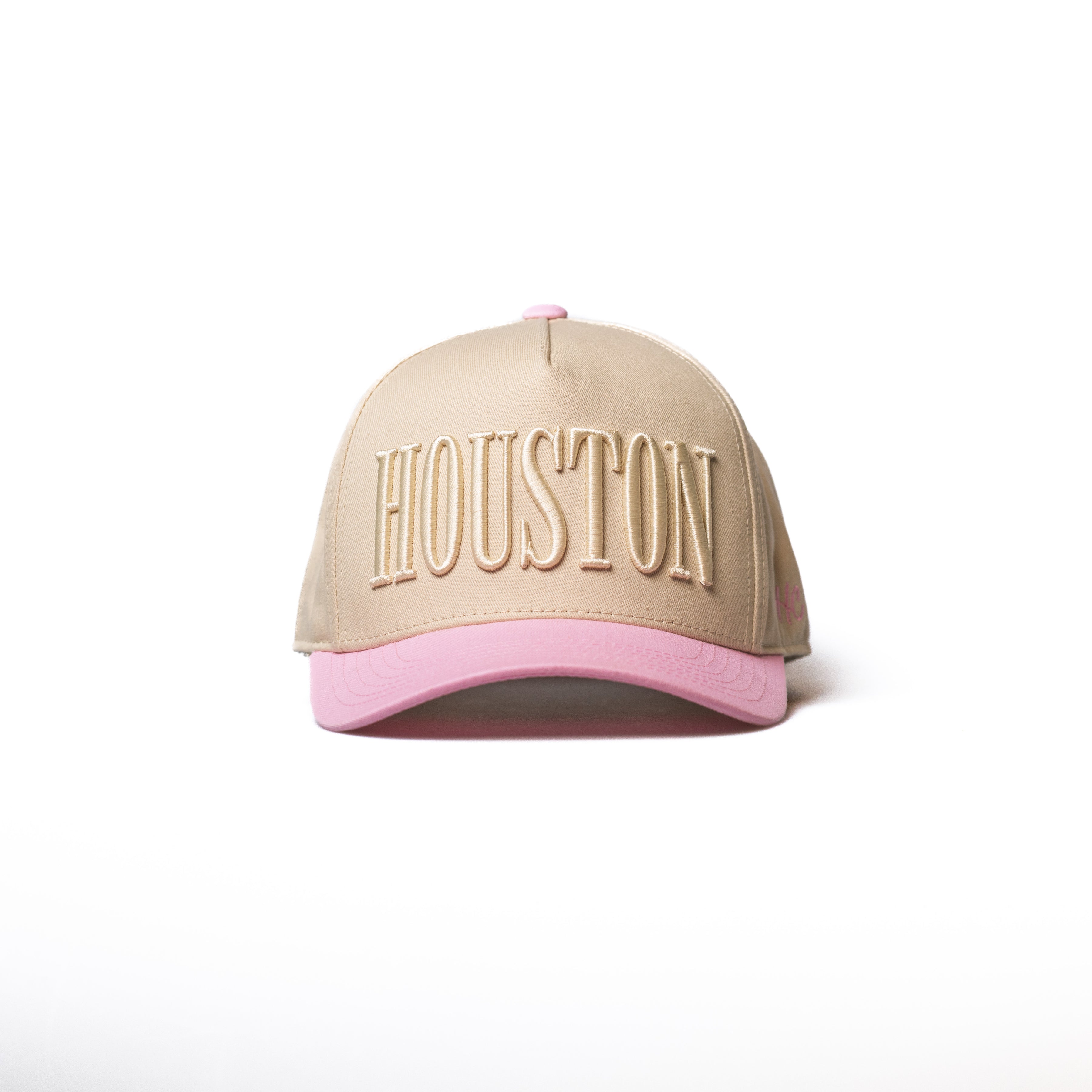 Off-white with pastel pink bill, large HOUSTON puff embroidery in all CAPS, DHC logo side panel, with pink interior taping.