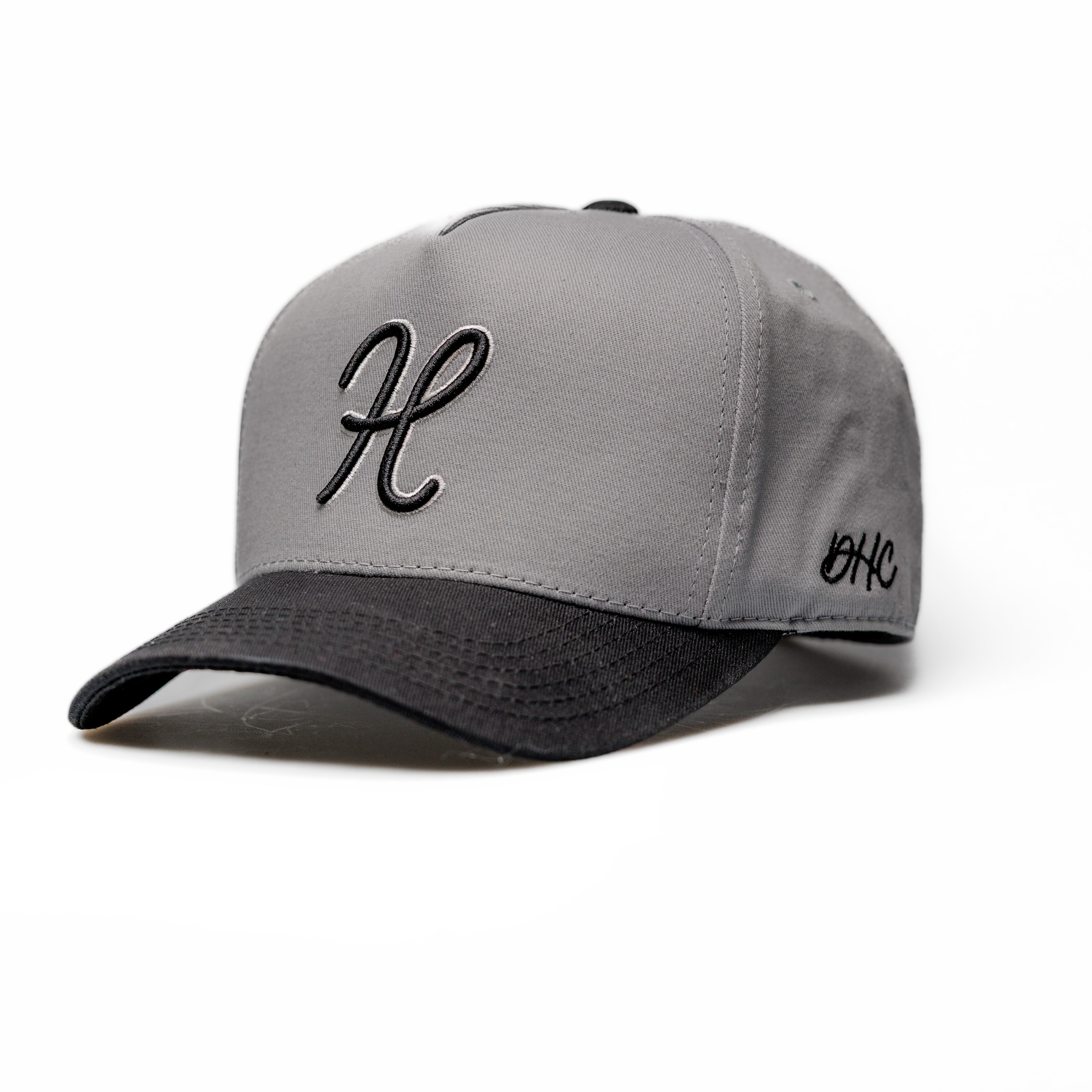 Gray with black bill snapback featuring The 'H' on front panel, black with white 'H', DHC logo side panel, and Decker Hat Co. logos interior.